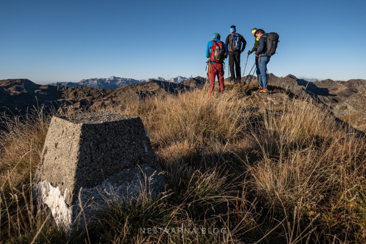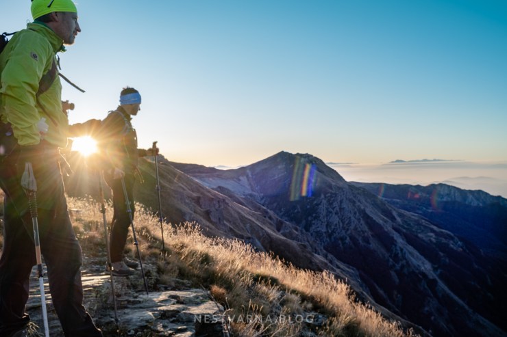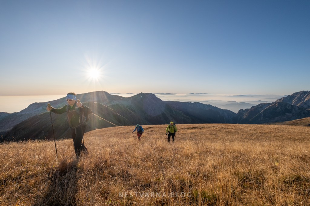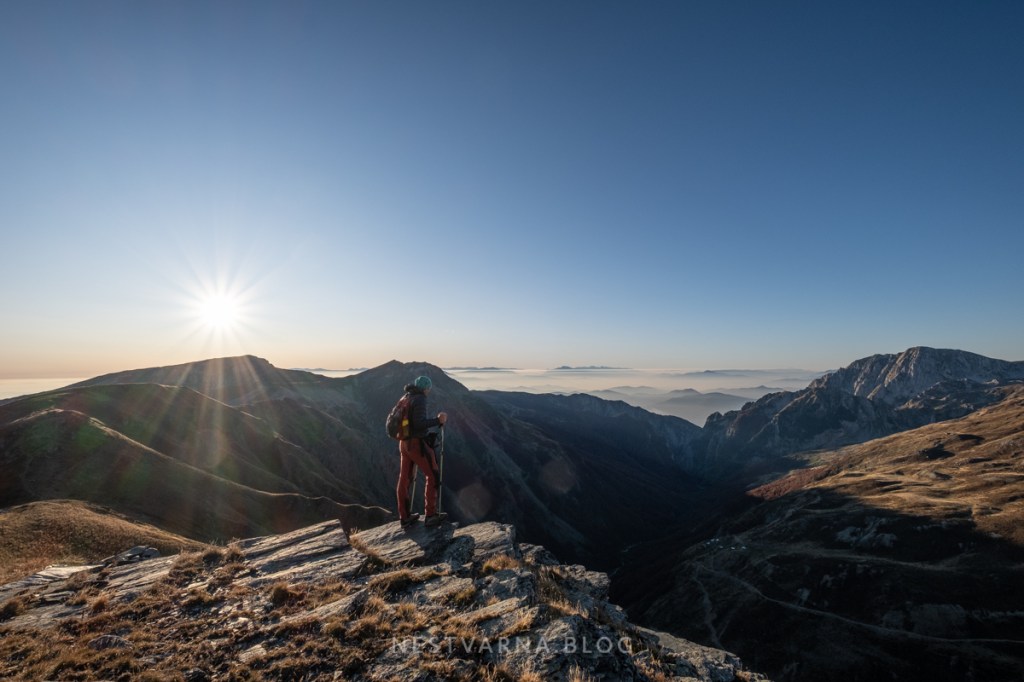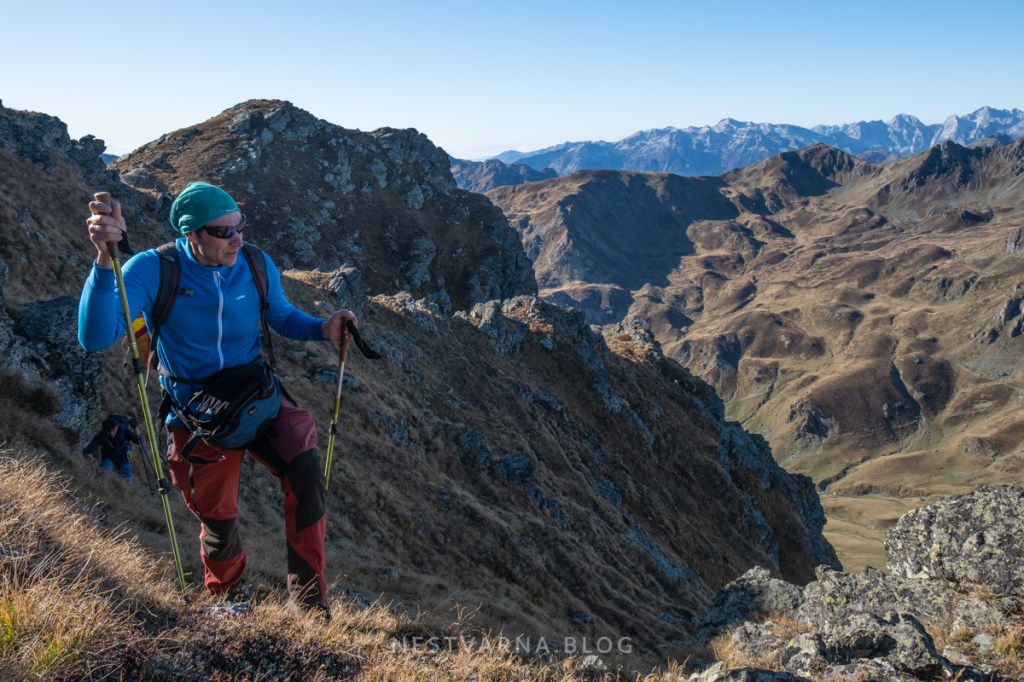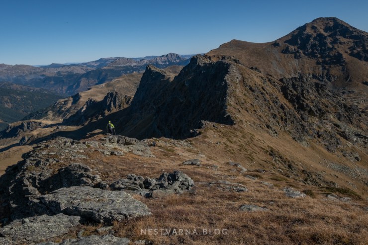 Qindmetërshat e parë po vazhdojmë t’i kalojmë prej shalës nëpër kullotat e gjerë deri kur veç tereni nisi të bëhet shkëmbor. Edhe pse në hapësir e kufizuar dhe pa shtegë të dukshëm. ecja nëpër kreshtën e dhëmbëzuar kufitare është atraktive dhe mjaft e sigurtë, pa pika shumë të theksuara.
