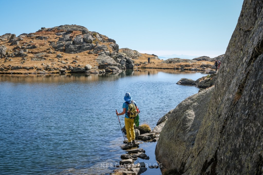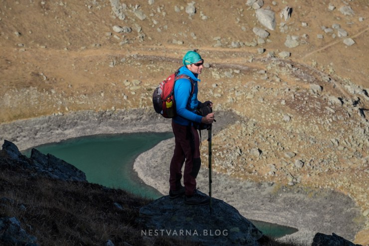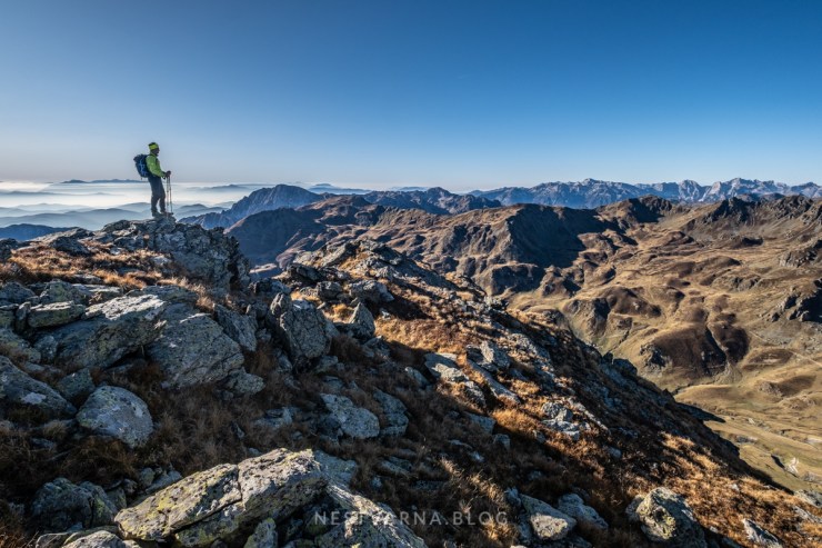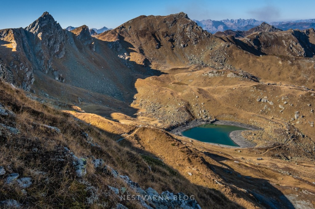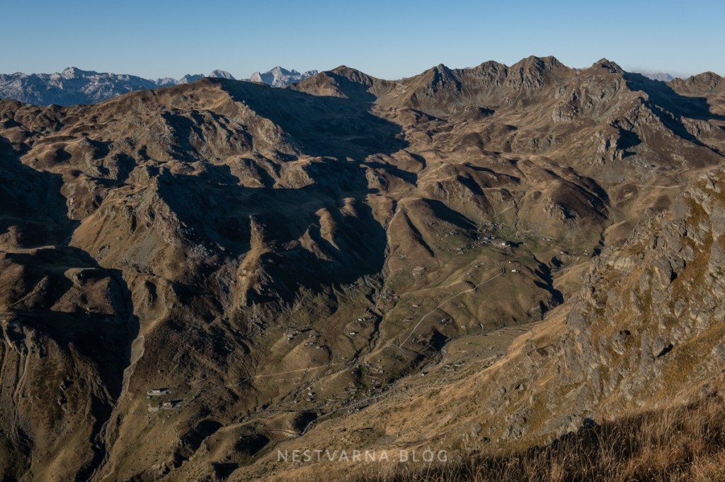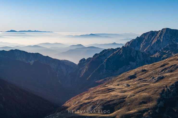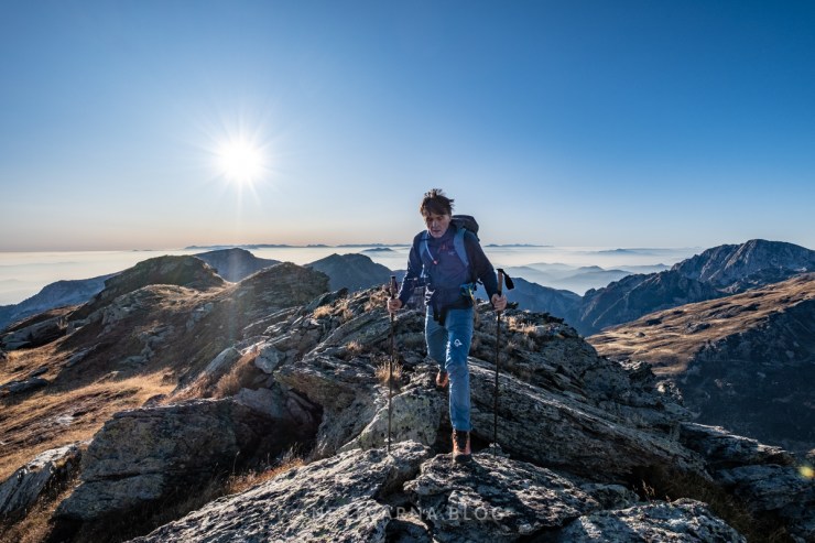 Qindmetërshat e parë po vazhdojmë t’i kalojmë prej shalës nëpër kullotat e gjerë deri kur veç tereni nisi të bëhet shkëmbor. Edhe pse në hapësir e kufizuar dhe pa shtegë të dukshëm. ecja nëpër kreshtën e dhëmbëzuar kufitare është atraktive dhe mjaft e sigurtë, pa pika shumë të theksuara.