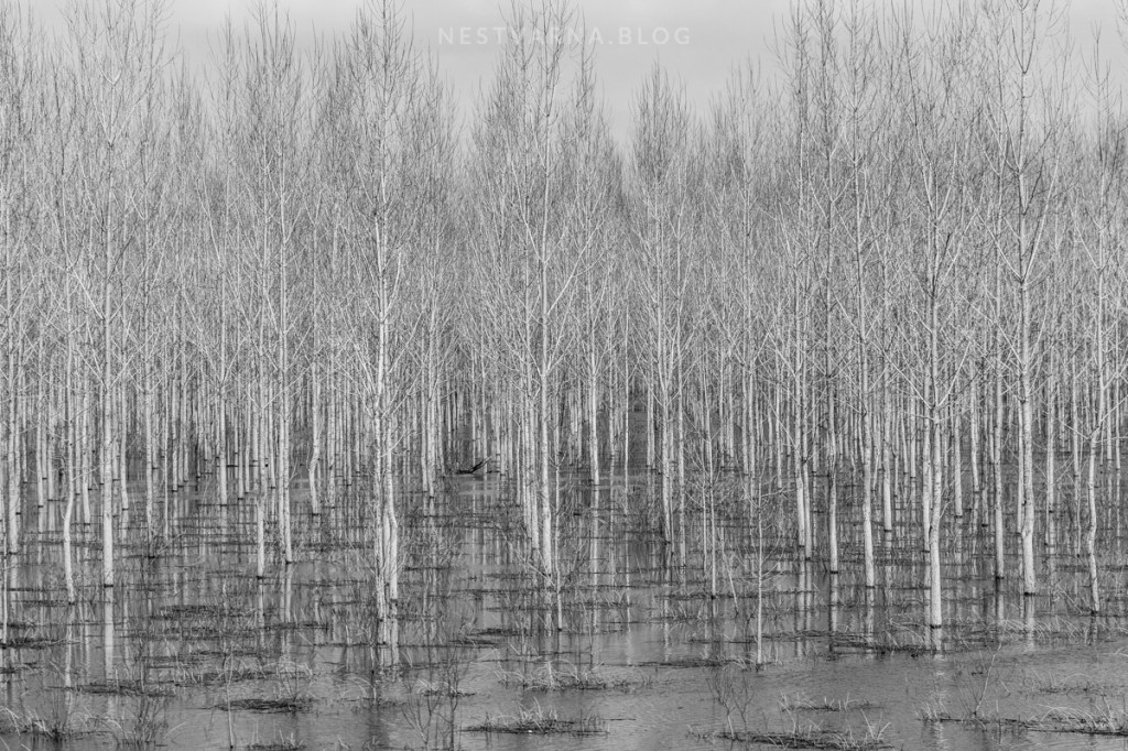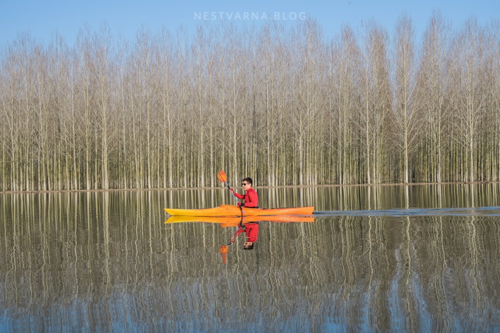 Geometrijski pravilna šuma topola prosto mami da prođemo kroz nju – veslanje kroz šumski matriks veliko je zadovoljstvo – osećaj kao da ste u nekoj video igrici.