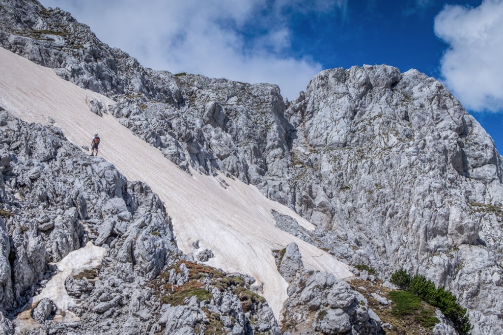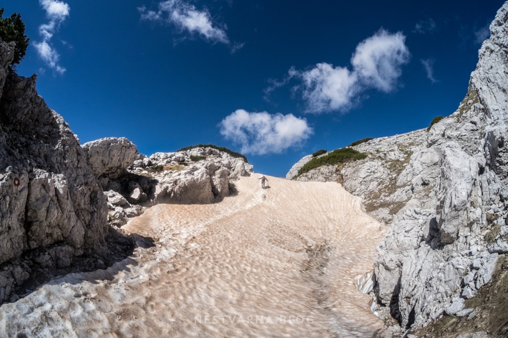 Krčimo stope u gnjecavom snegu. Međutim “via normale” ubrzo u potpunosti iščezava pod snežnim pokrivačem a mi nažalost nismo poneli dereze i cepin. Bez zimske opreme prolazak ovakvim terenom se smatra veoma rizičnim, majski sneg ne treba potcenjivati.