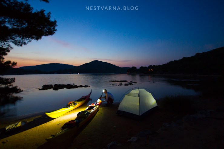 Nakon 7 sati veslanja uplovljavamo u mirnu uvalu na Lavsi sa unutrašnje strane. 40 kilometara smo prešli. Zasluženi odmor, okrepa, kupanje i priprema kampa za noćenje na magičnom mestu.
