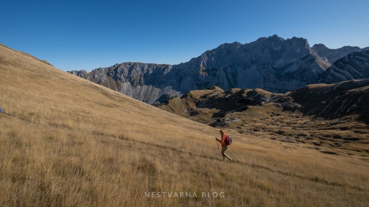 Zahtevni deo uspona je međutim tek bio pred nama, jer silaskom na jezero visinski smo se praktično vratili na početnu tačku (sa 2400m nazad na 1750m). Iz Škrke planiramo da kroz Samar prevalimo u susednu ledničku dolinu (Valoviti do, Zeleni vir).