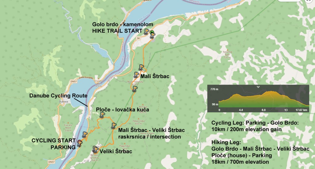 Automobil ćemo ostaviti kao i svaki put, na piknik parkingu ispod Velikog Štrpca a do početne tačke planinarenja na Golom brdu ćemo se odvesti biciklima u instant duhu cikloturizma! Dunavska ciklo ruta (EuroVelo 6) je poslednjih godina sve popularnija u evropskim okvirima, a upravo prolazak kroz Đerdapsku klisuru predstavlja njen najatraktivniji (i najmanje prometan) deo.