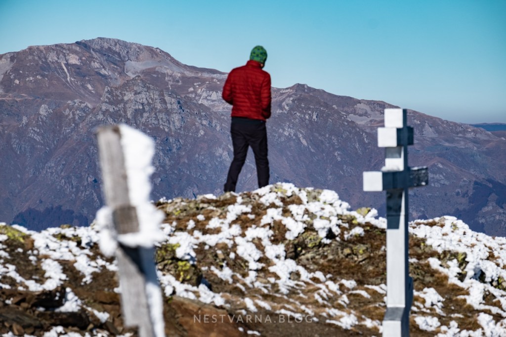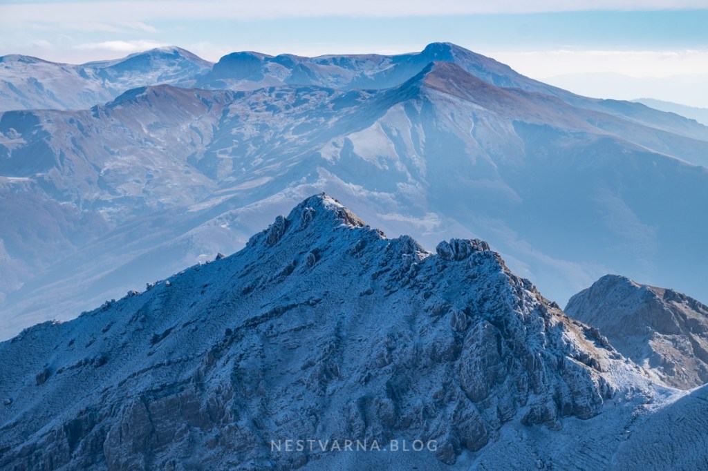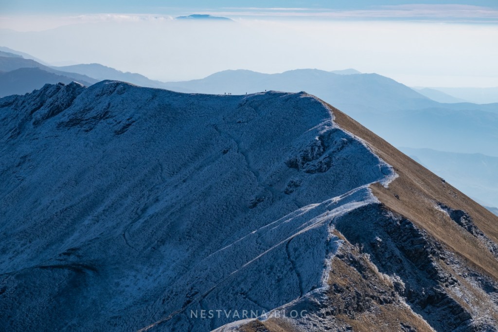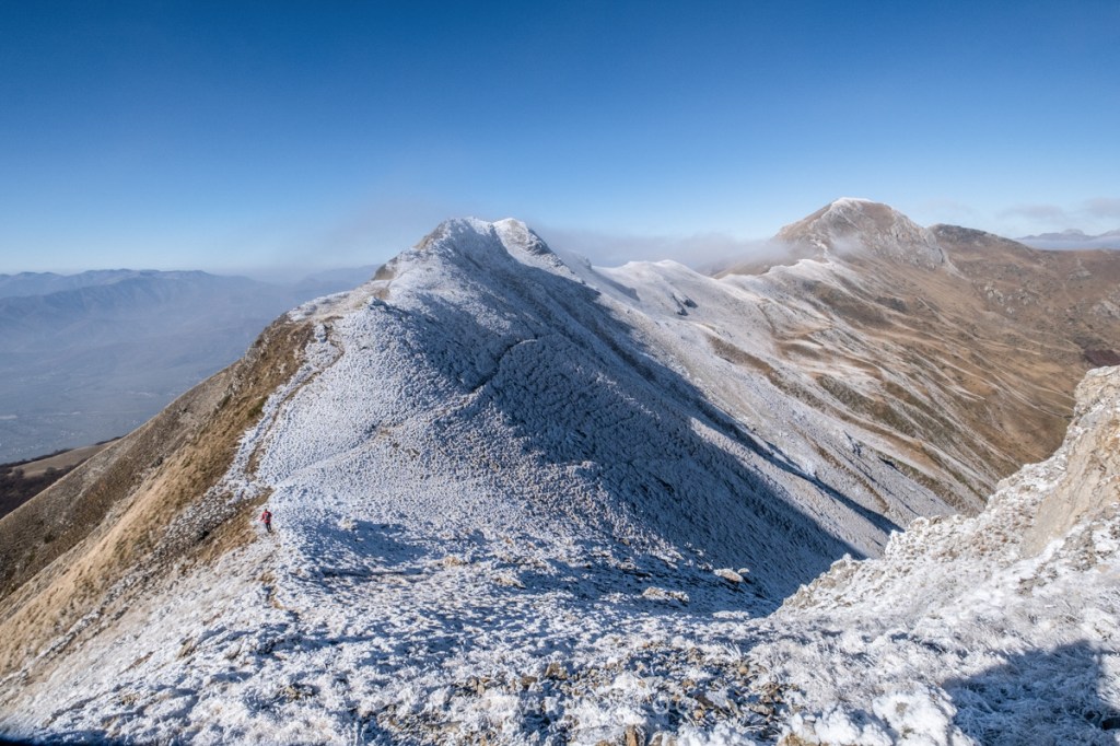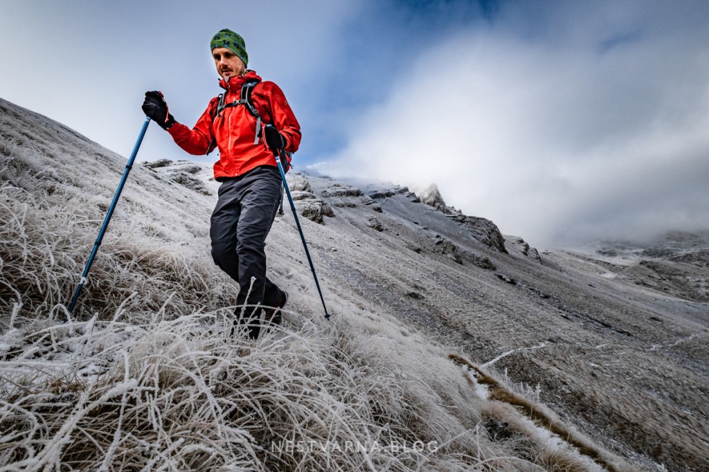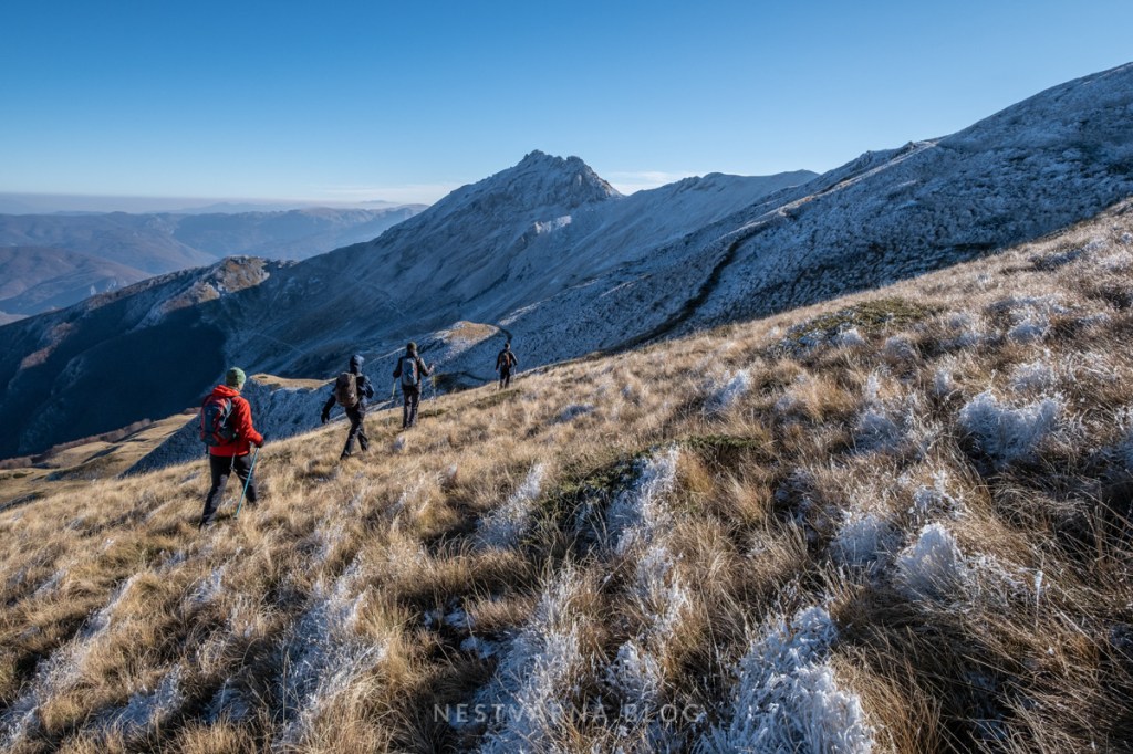 Prvi metri silaska sa Rudine su predstavljali kratkotrajni tehnički izazov u trenutnim uslovima na planini. Nakon toga smo mogli u potpunosti da odahnemo i prepustimo se čarima grebenarenja između dva godišnja doba i dve države. Korak levo, ka Albaniji, niti jedne pahulje, a samo par koraka udesno, u Makedoniji, pravi vetroviti zamrzivač.
