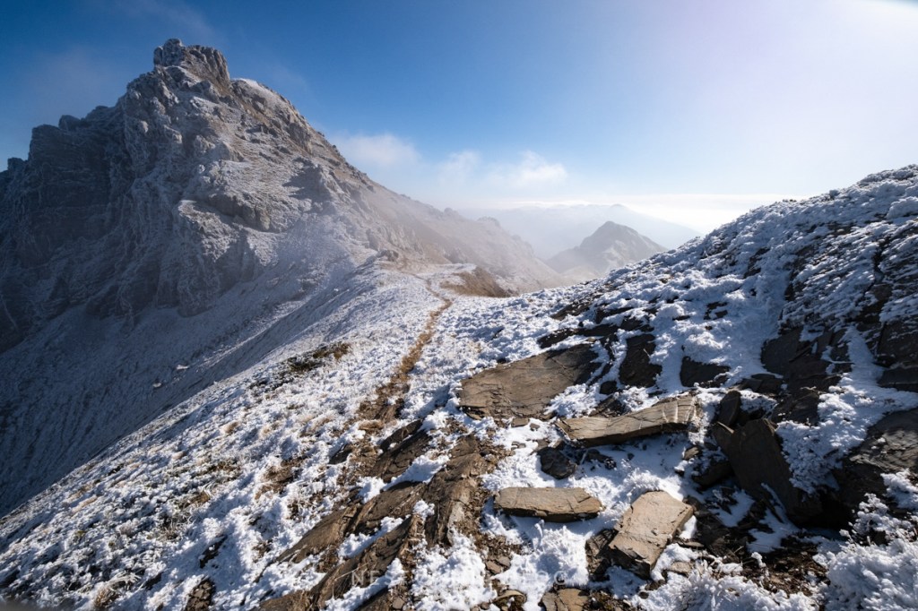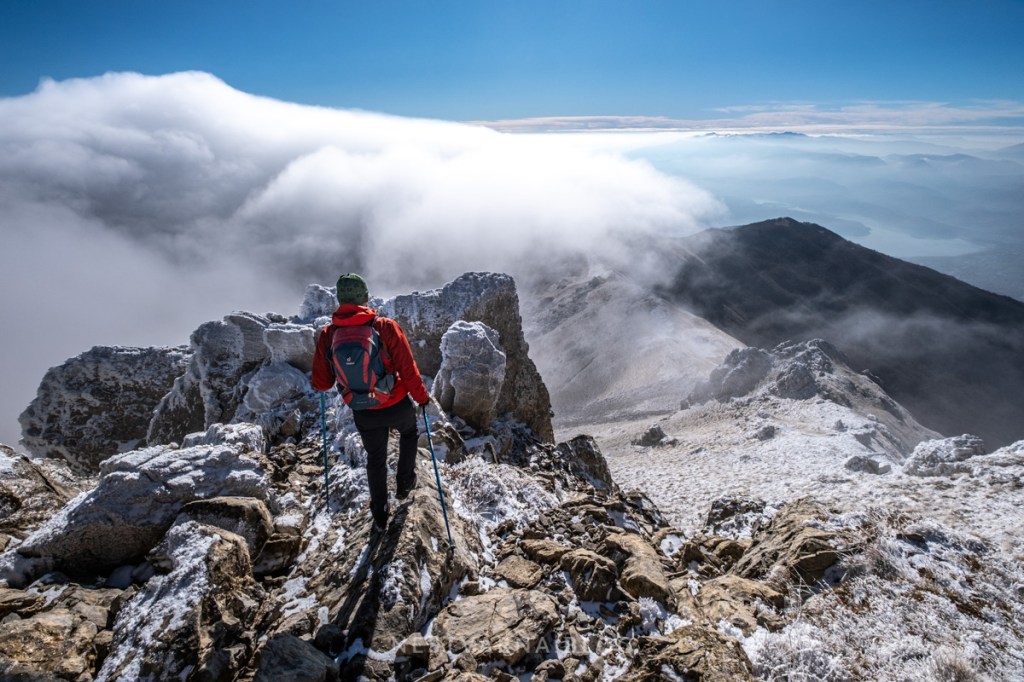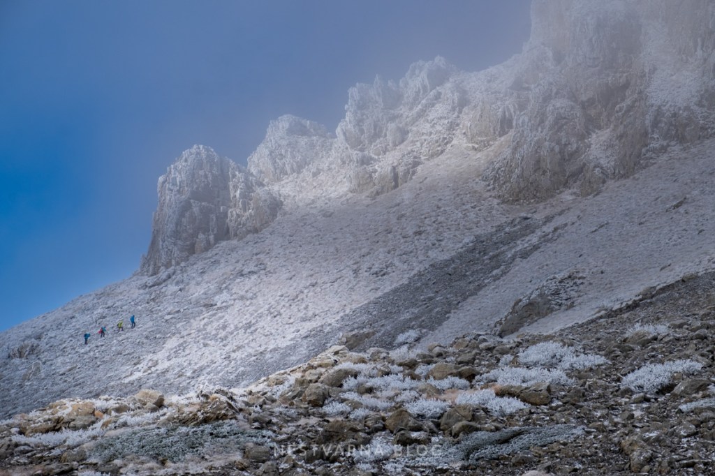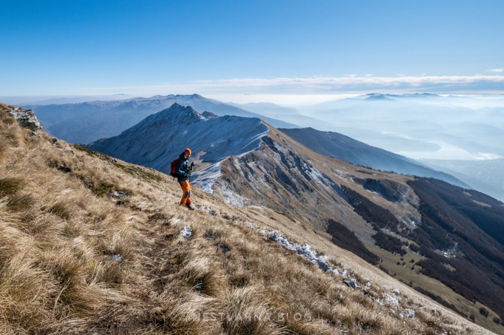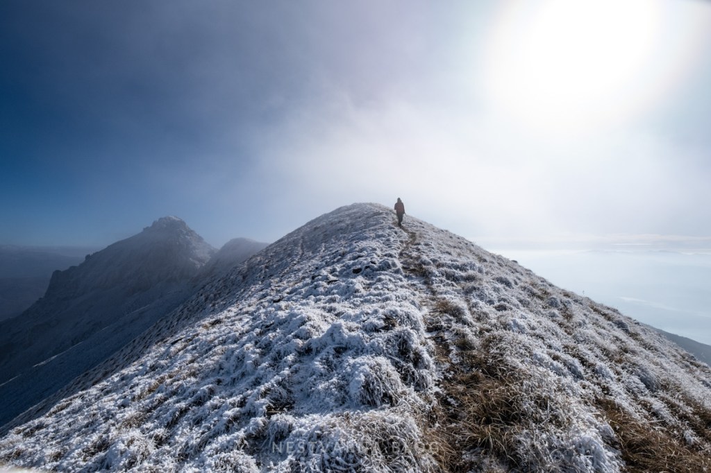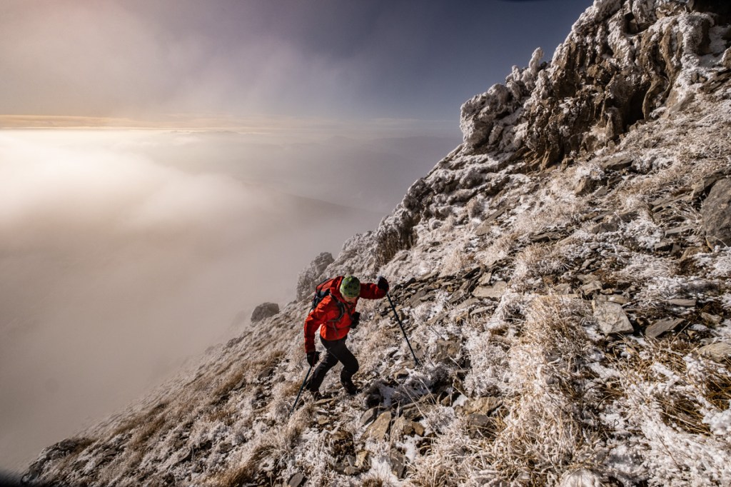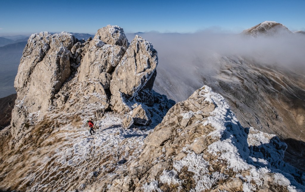Prvi metri silaska sa Rudine su predstavljali kratkotrajni tehnički izazov u trenutnim uslovima na planini. Nakon toga smo mogli u potpunosti da odahnemo i prepustimo se čarima grebenarenja između dva godišnja doba i dve države. Korak levo, ka Albaniji, niti jedne pahulje, a samo par koraka udesno, u Makedoniji, pravi vetroviti zamrzivač.