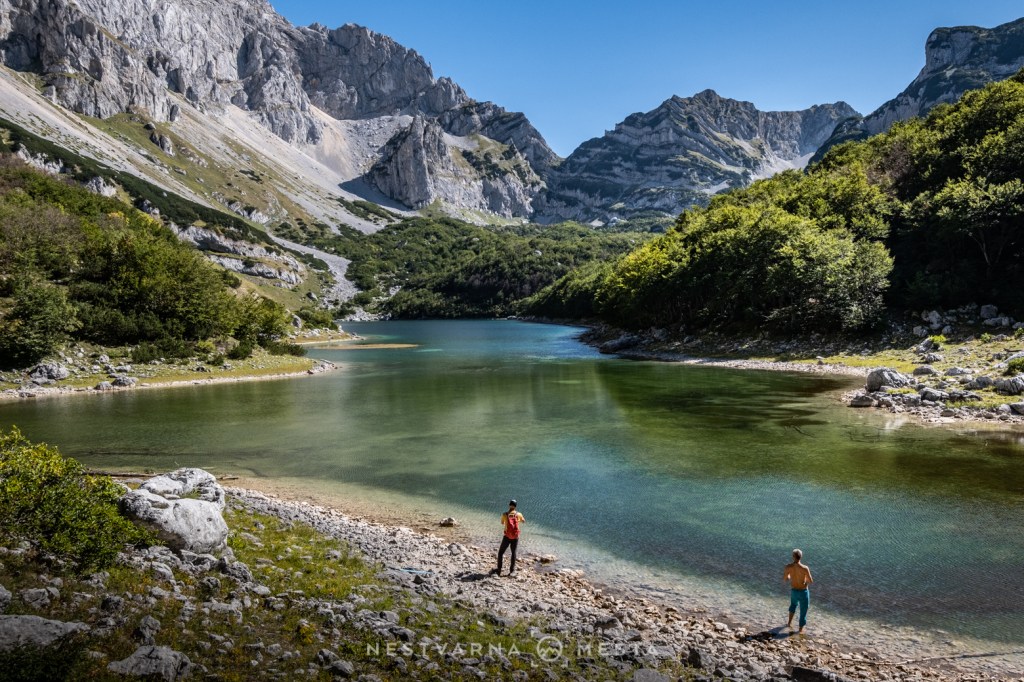 Silazak u Škrku je glavni izazov transverzale. Umesto okolo, preko Botuna, krenuli smo direkt dole kroz Sulundar, slabije uočljivom, ali ipak markiranom stazom. Staza je strma, ali u uslovima suvog vremena apsolutno bezbedna. Korak treba da bude spor i strpljiv. Iako se jezero čini nadomak, potrebna su i cela dva sata pažljivog silaska, da bi se savladala negativna visinska razlika od 600m između Planinice i Škrčkog jezera.