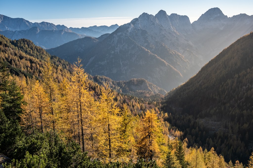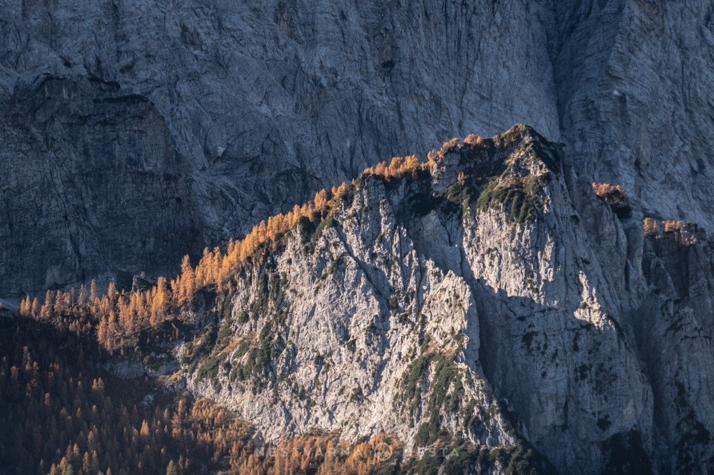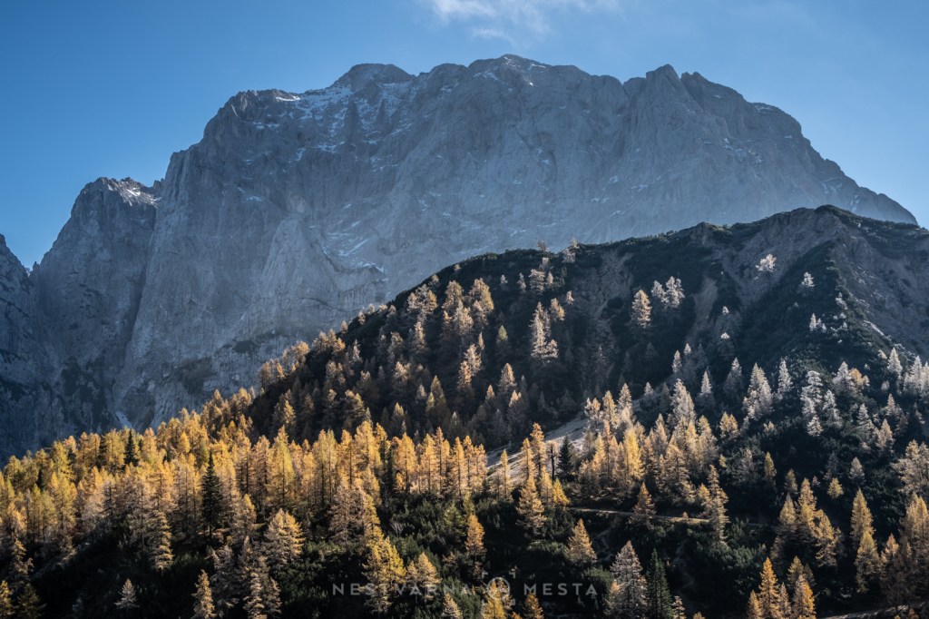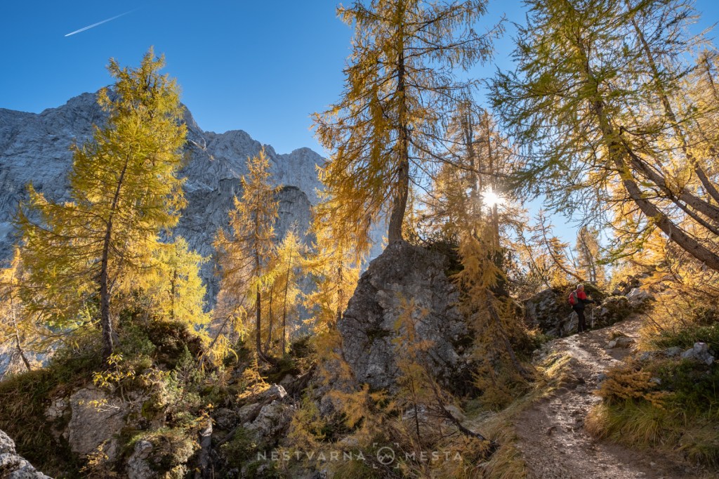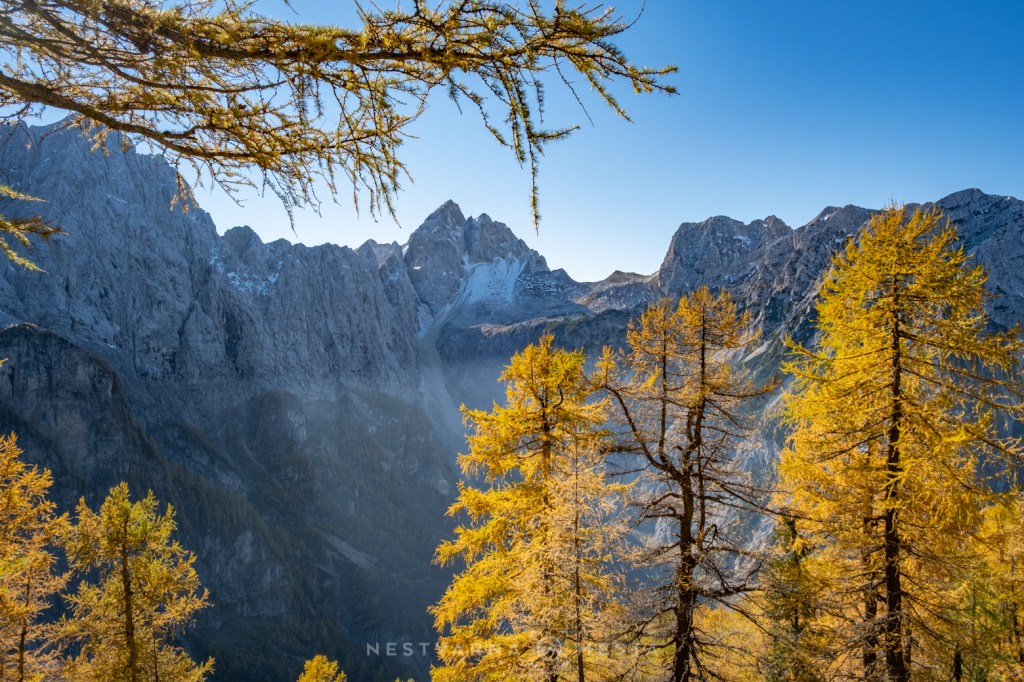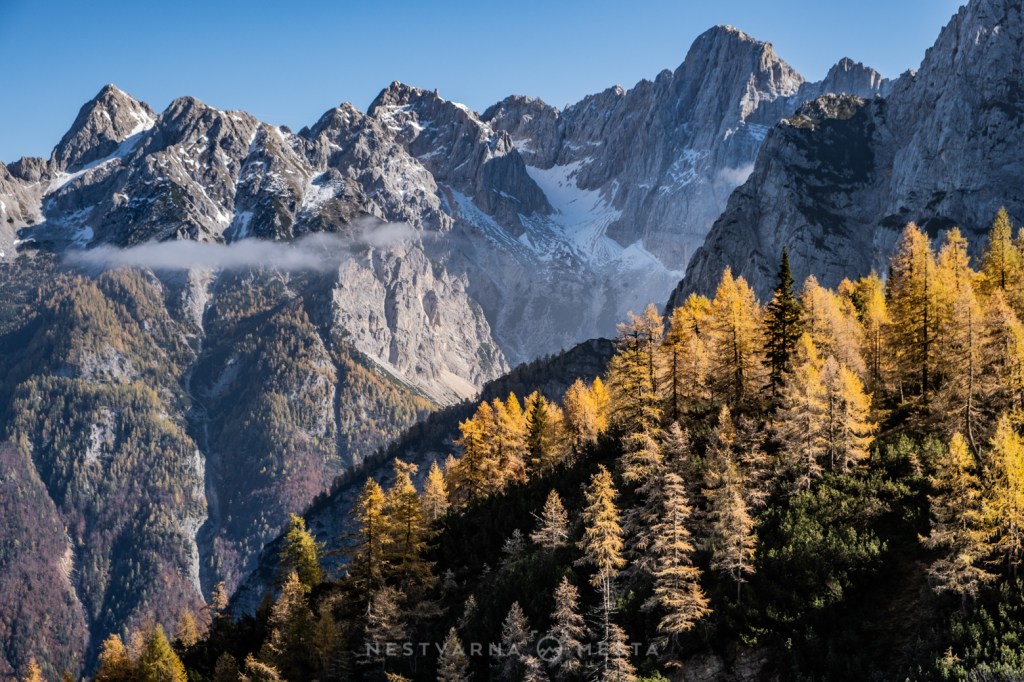 Žar macesni pod zracima niskog oktobarskog sunca sa tamnom pozadinom ozeblih litica Prisojnika, Škrlatice i Mojstrovke kreira nestvarnu gorsku kulisu…