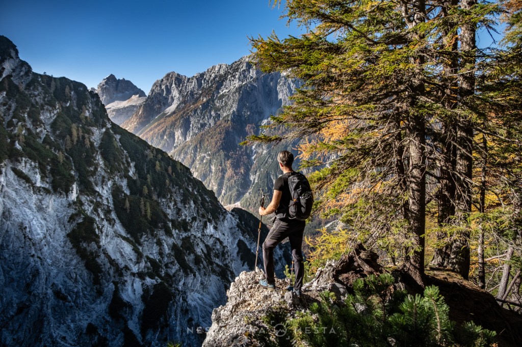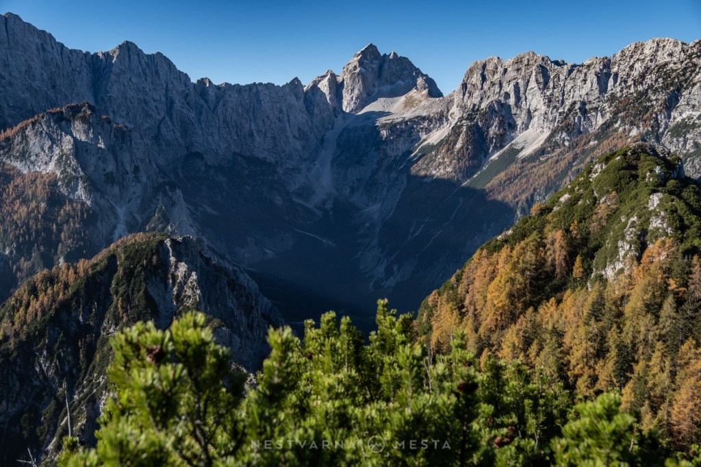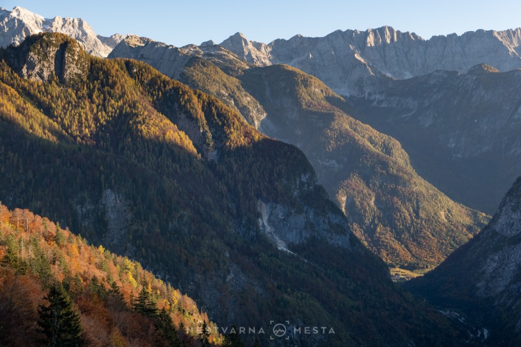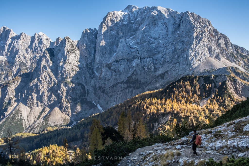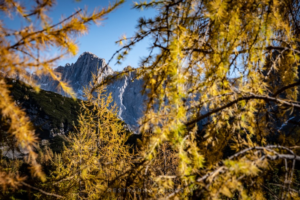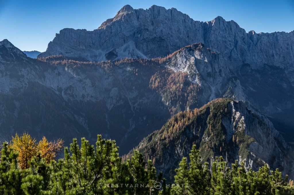 Žar macesni pod zracima niskog oktobarskog sunca sa tamnom pozadinom ozeblih litica Prisojnika, Škrlatice i Mojstrovke kreira nestvarnu gorsku kulisu…