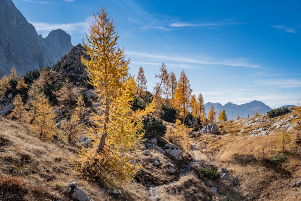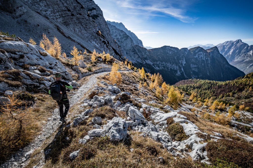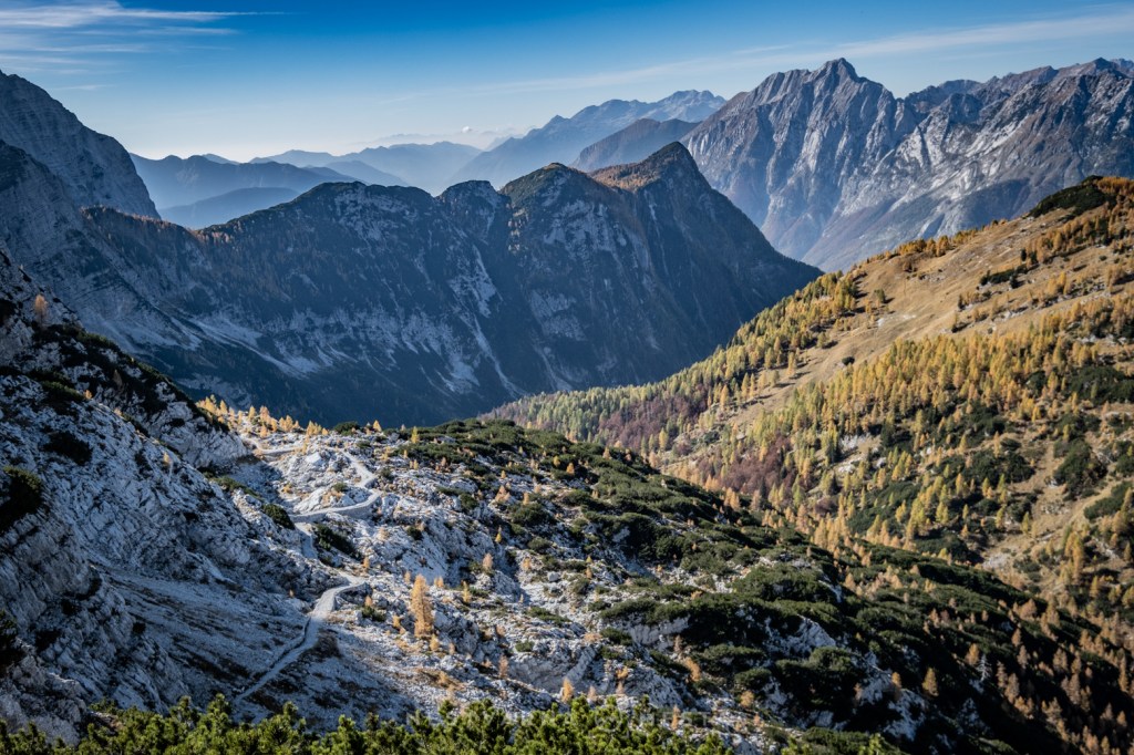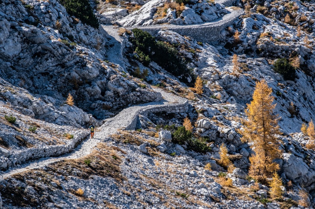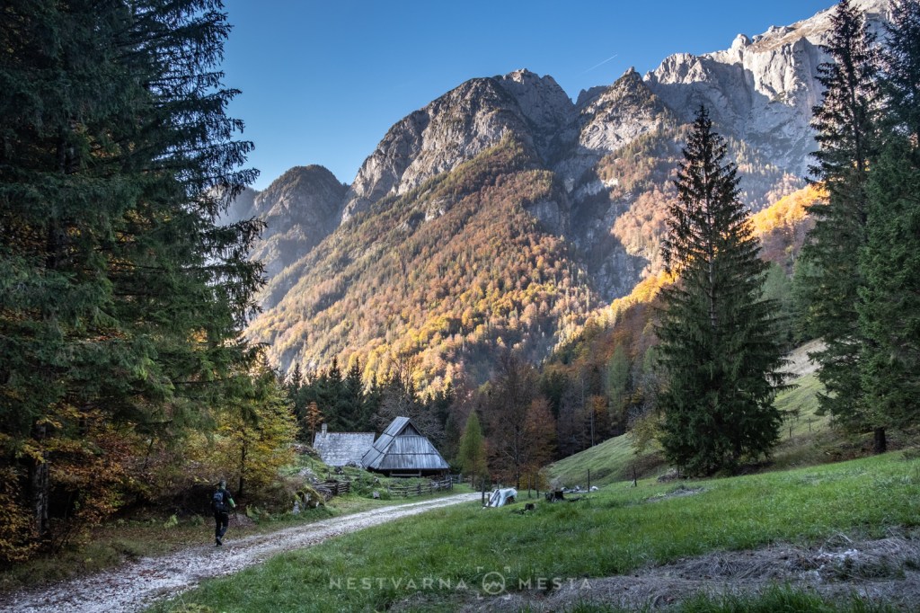 Dok iz Gorenjske prevaljujemo u Primorsku istorijsku pokrajinu, čudovite macesne ponovo ukrašavaju gorski pejzaž. Sa prevoja je započeo i konačni, maratonski silazak u dolinu. Sa 2071m spustićemo se u Trentu na samo 650m nadmorske, “čez Dol” kroz dolinu Zadnjica.