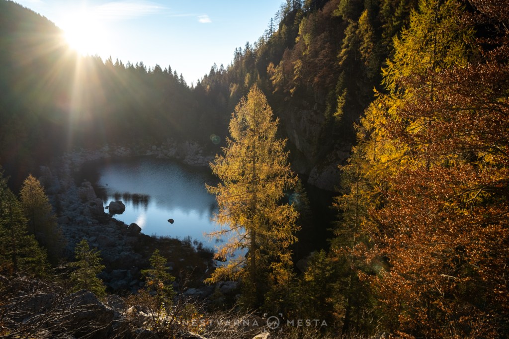Črno jezero je ušuškano u gustoj šumi Nacionalnog parka, u tamnoj seni okruženo macesnama a koje je jutarnje sunce već obojilo u zlato.