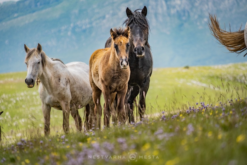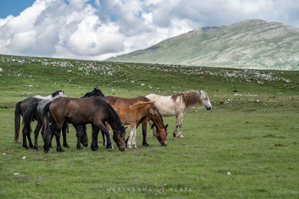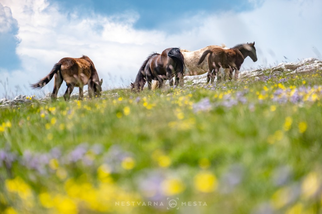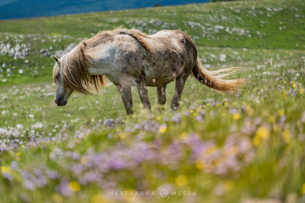 Konje nismo morali dugo da tražimo. Prepušteni sami sebi, jedinke svih boja i uzrasta tumaraju Kruzima u nekoliko većih i manjih grupa. Na planini je procvetalo proleće – uz obilje hrane, grla su očekivano fokusirana na ispašu.