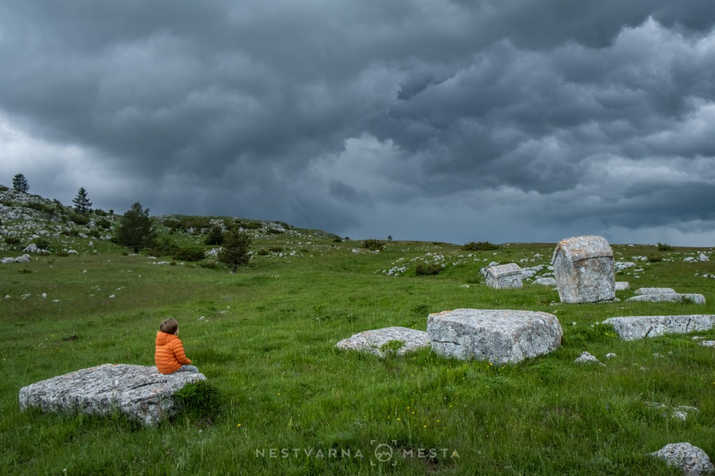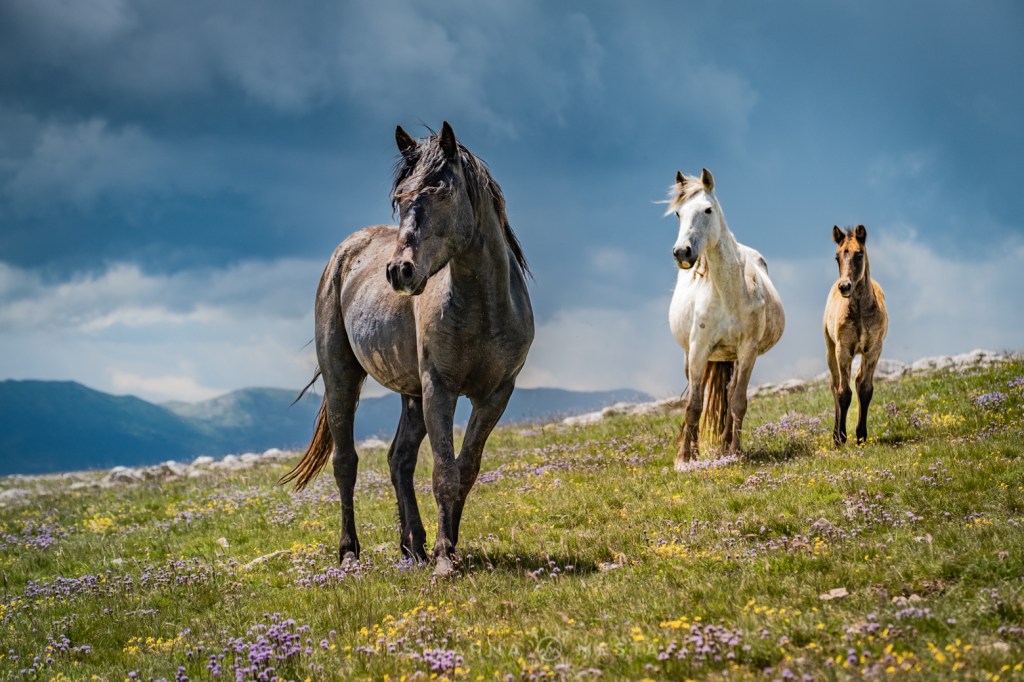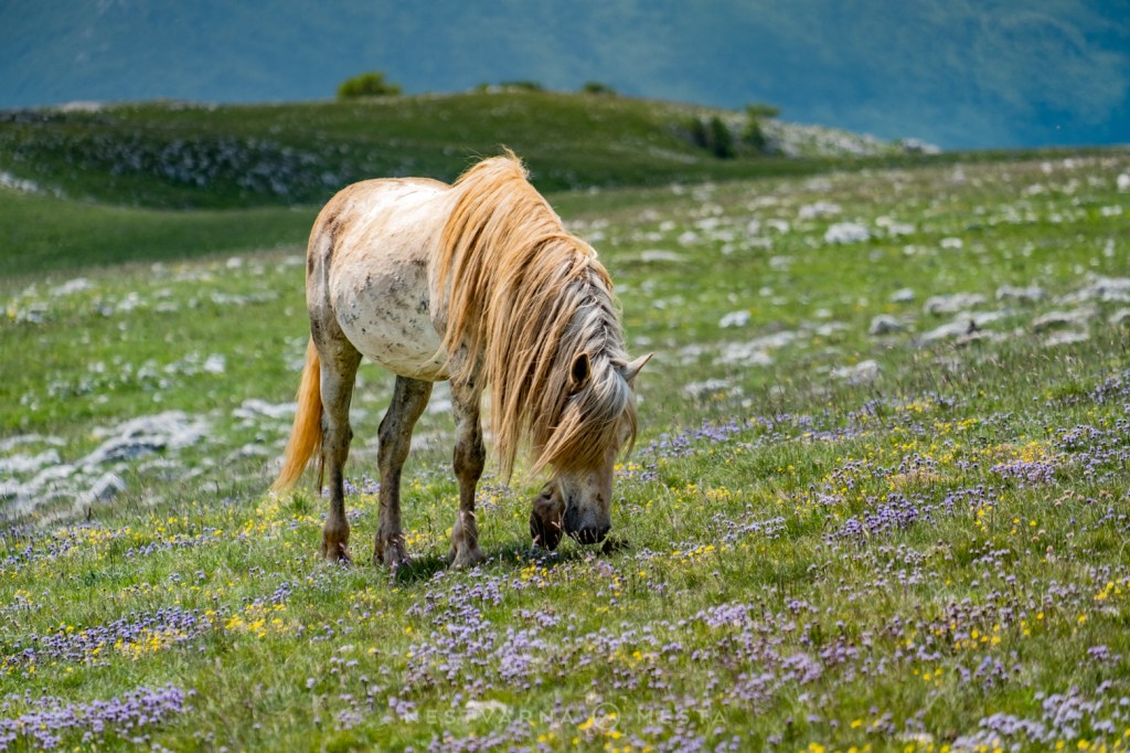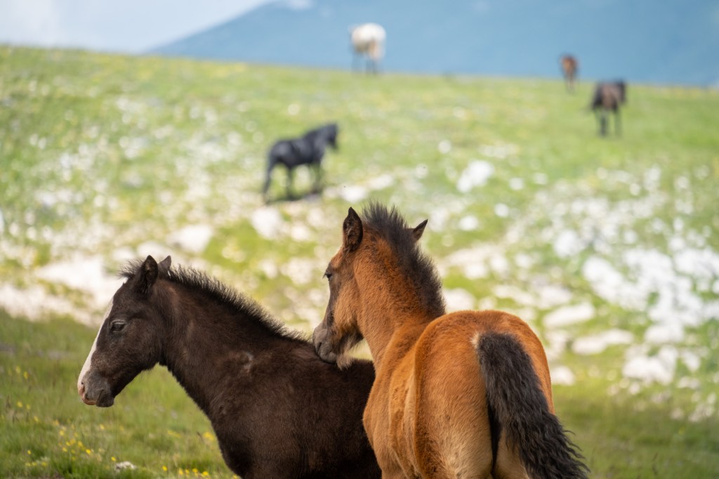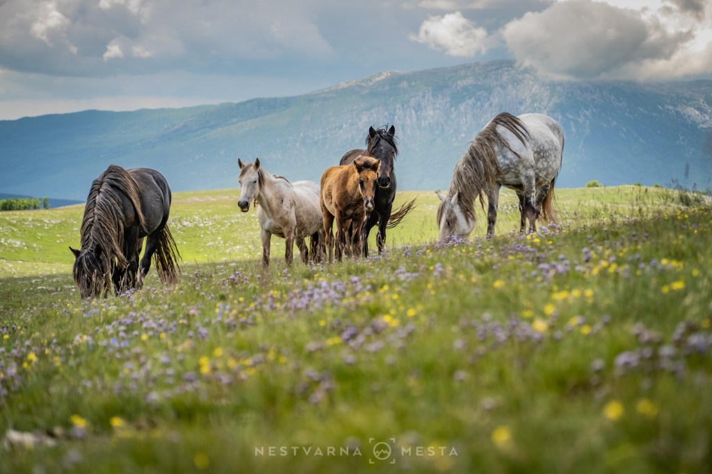 Konje nismo morali dugo da tražimo. Prepušteni sami sebi, jedinke svih boja i uzrasta tumaraju Kruzima u nekoliko većih i manjih grupa. Na planini je procvetalo proleće – uz obilje hrane, grla su očekivano fokusirana na ispašu.