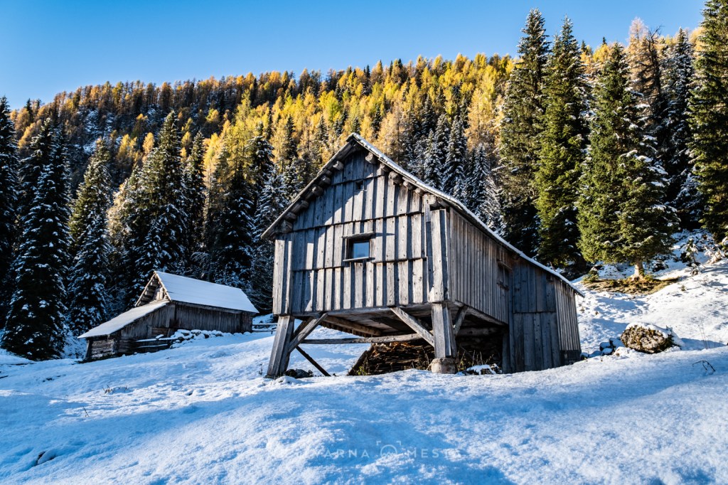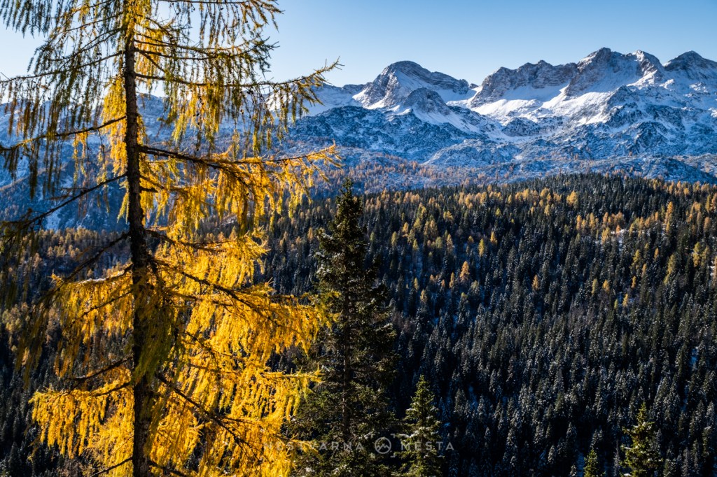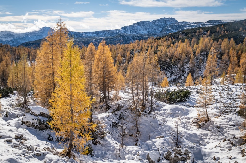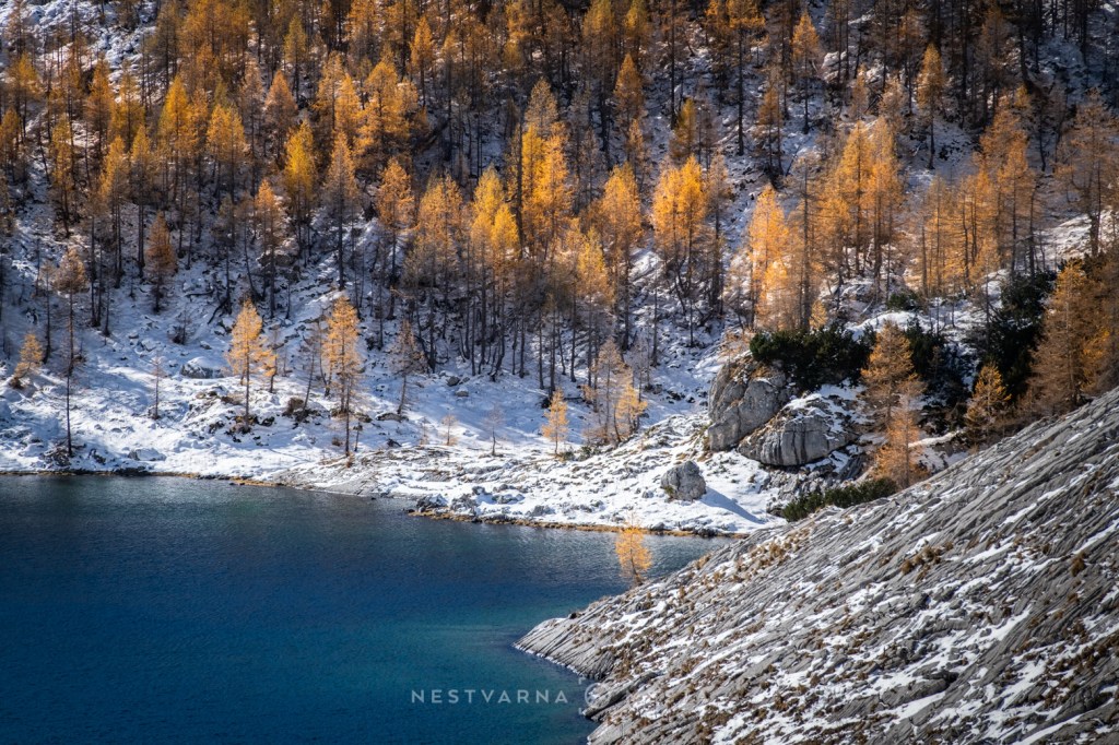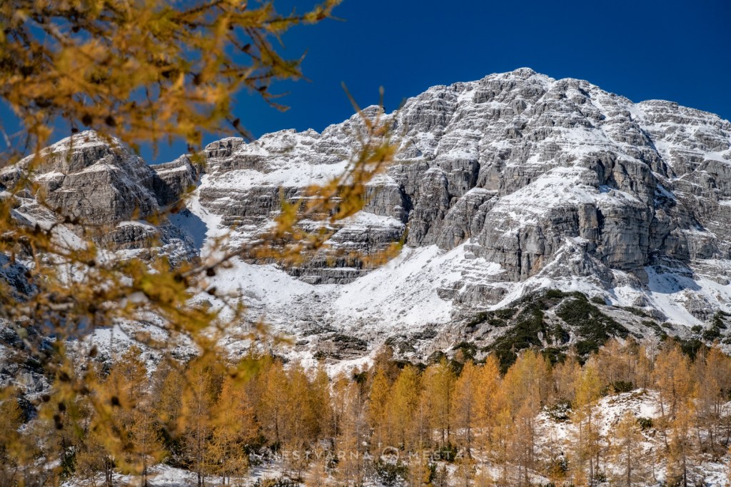 Koračamo kroz vatrene tonove proređene alpske šume. Macesna ili ariš (larix decidua) je zaštitni znak doline Triglavskih jezera. Ovo drvo je najviše zaslužno za nestvarne prizore koje ovde zatičemo u poznu jesen. To je jedini “igličavac” čije četine pred zimu žute, i naposletku opadaju. Obično se to desi uz mraz i jesenje kiše.