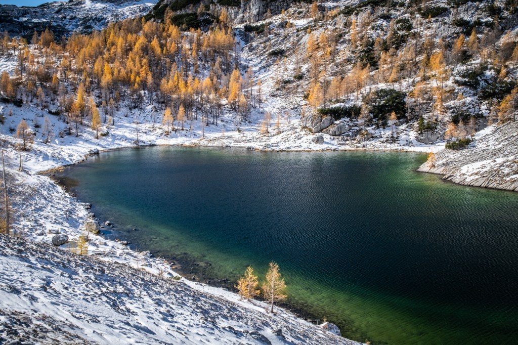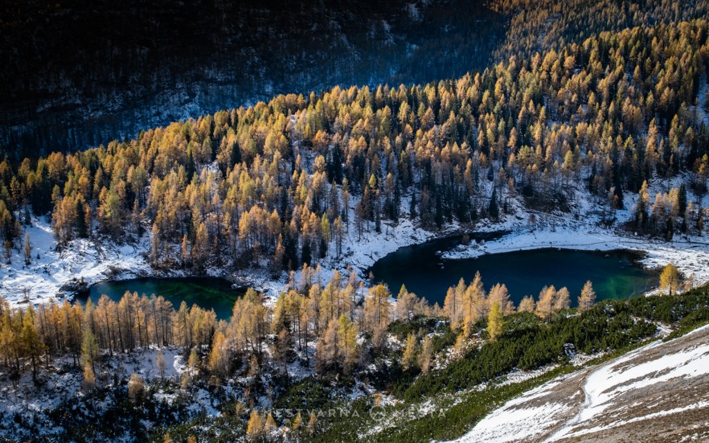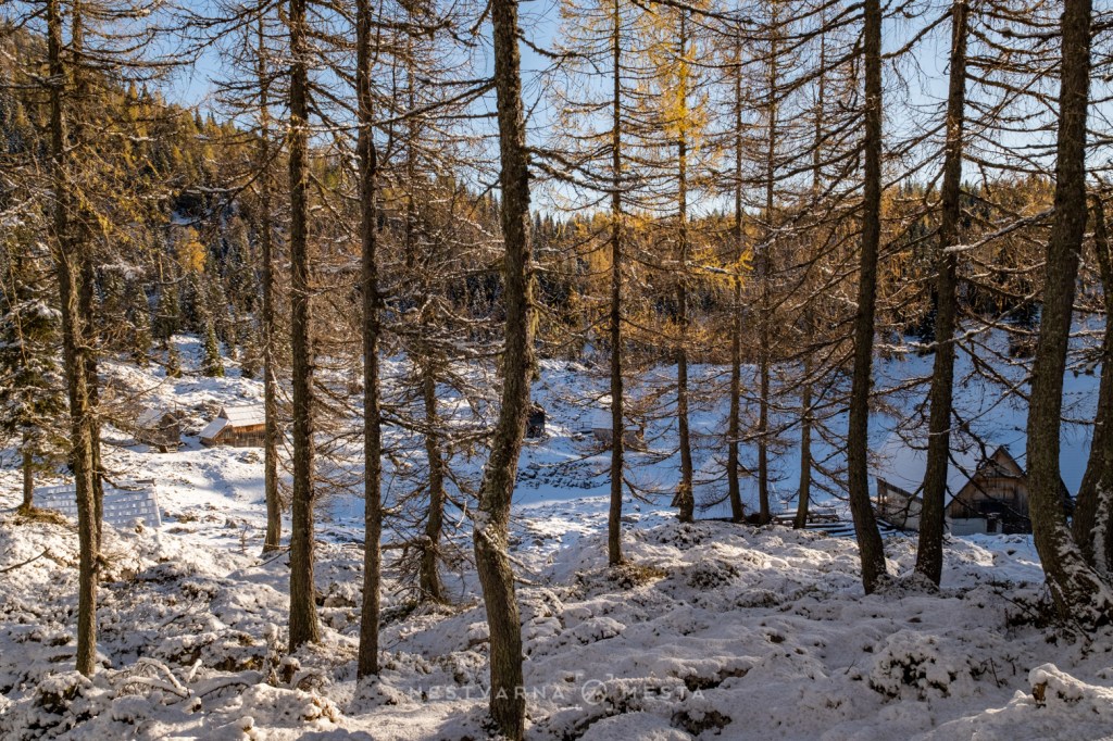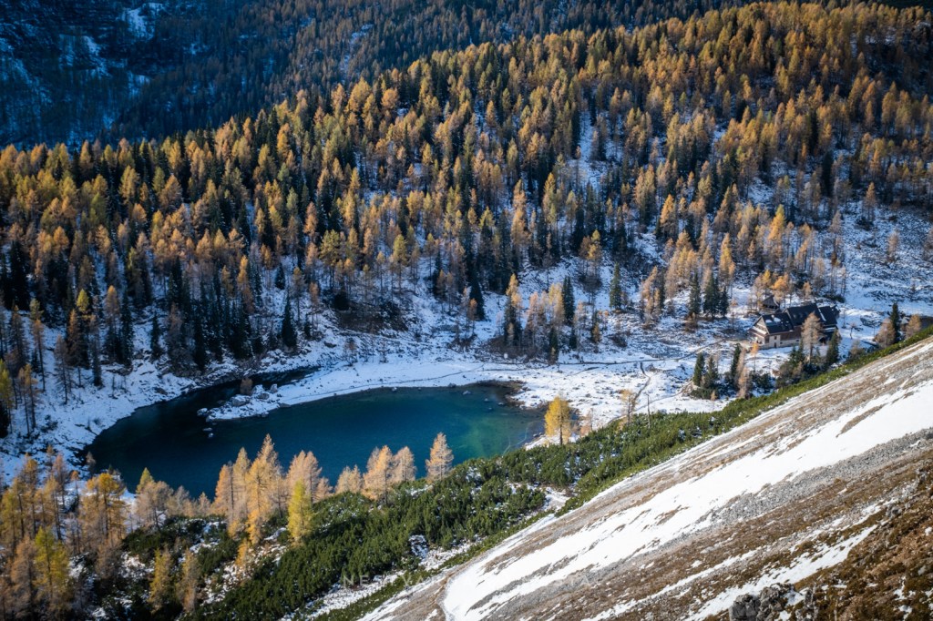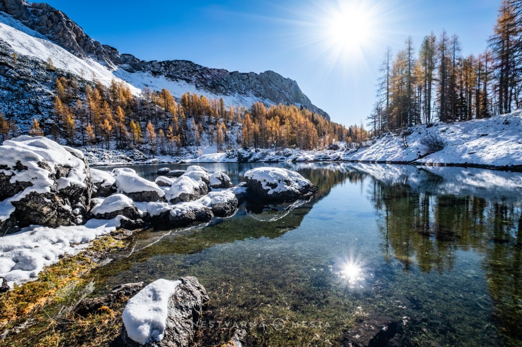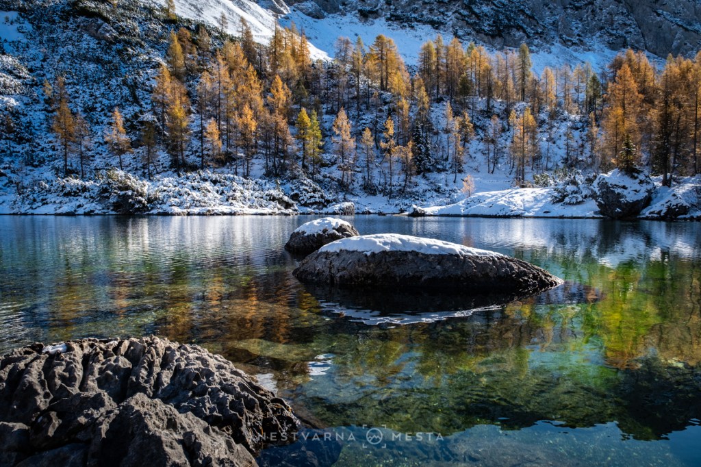 Treća put sam ovde. Prvi put u pravom sudaru jeseni i zime – sneg i ožarene macesne u istom kadru! Nikad ovoliko vode u jezerima. Kao da je početak proleća a ne kraj jeseni. Donje i gornje Dvojno jezero spojeni u jedno, kako ime nalaže.