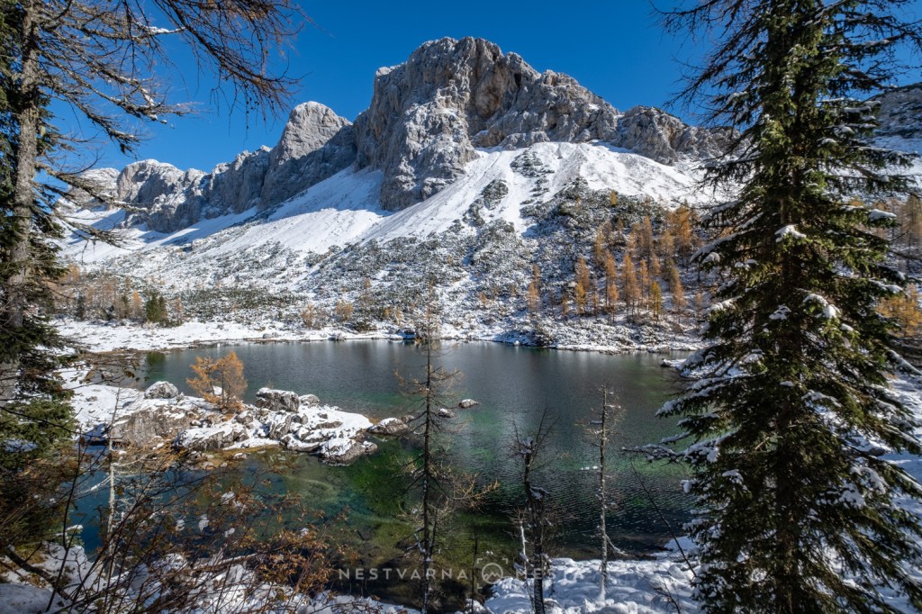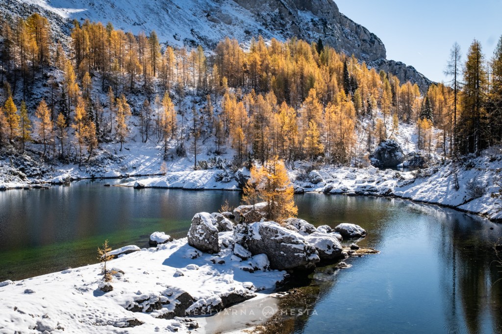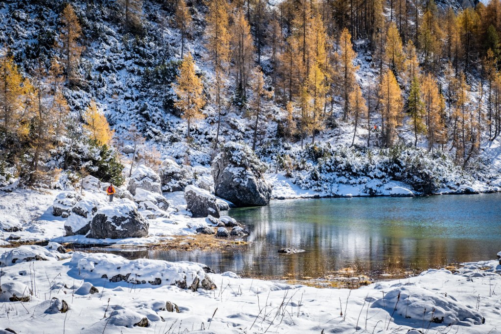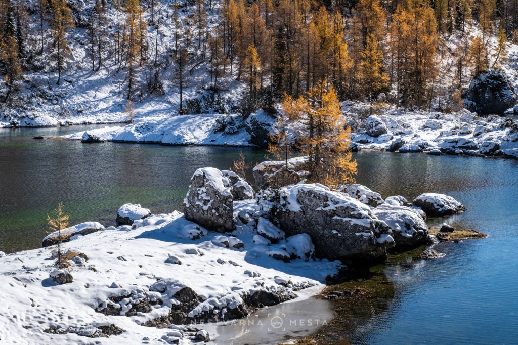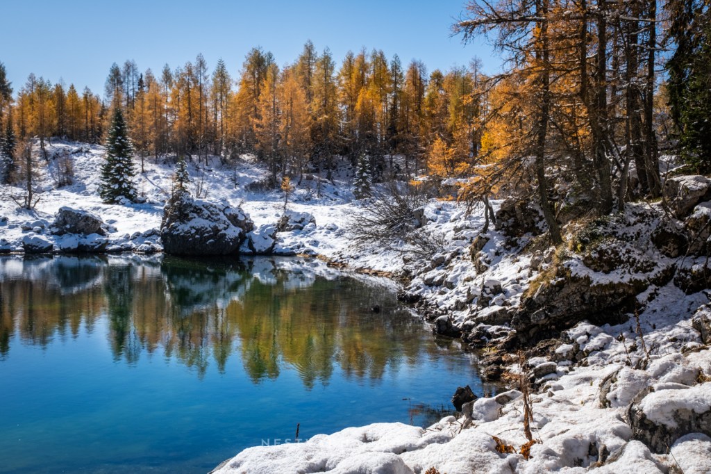 Treća put sam ovde. Prvi put u pravom sudaru jeseni i zime – sneg i ožarene macesne u istom kadru! Nikad ovoliko vode u jezerima. Kao da je početak proleća a ne kraj jeseni. Donje i gornje Dvojno jezero spojeni u jedno, kako ime nalaže.